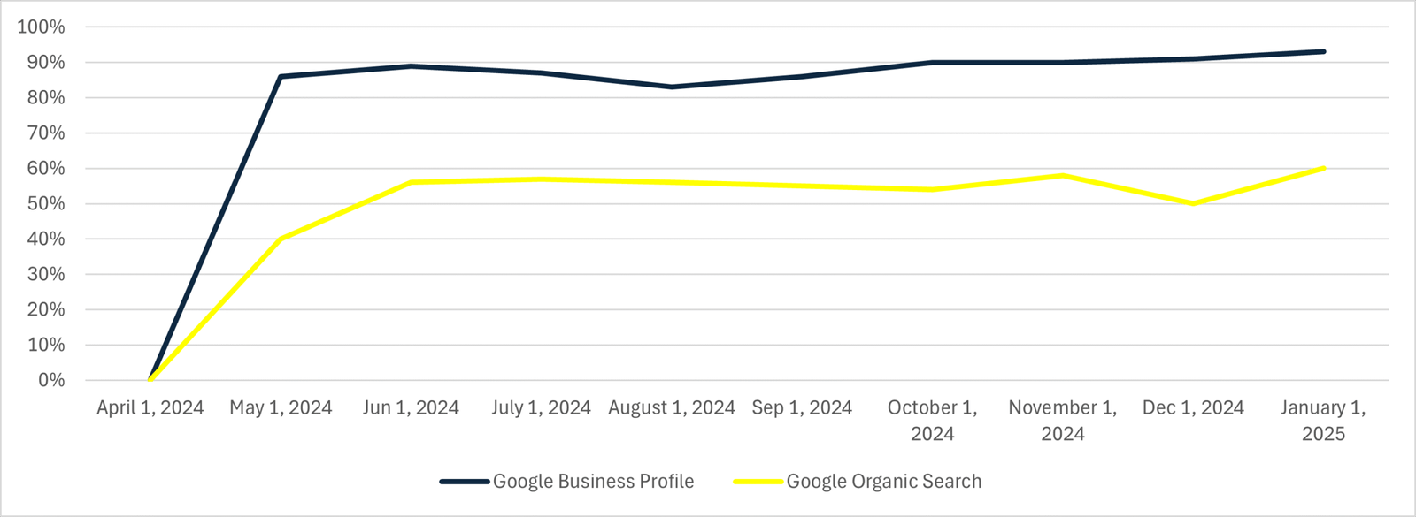 Za američkog klijenta u izrazito konkurentnoj industriji razvili smo ciljanu SEO strategiju s fokusom na lokalno rangiranje i optimizaciju Google Business profila. Kroz tehnički SEO, strategiju sadržaja na web stranici i uz kontinuirano praćenje i samu analizu konkurencije, – porast klijentovog rangiranja vidljiv je već u prvim mjesecima. Vidljivost klijentovog profila je dosegnuo preko 90%, dok je organska vidljivost gotovo utrostručen. U izazovnom okruženju uspjeli smo klijenta pozicionirati na vrh google-a, s dugoročnim zadržavanjem njegovih pozicija i stabilnim rastom.